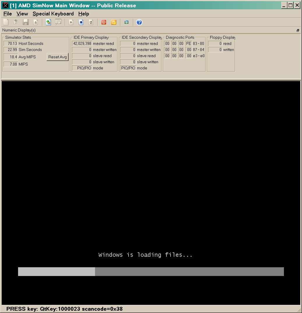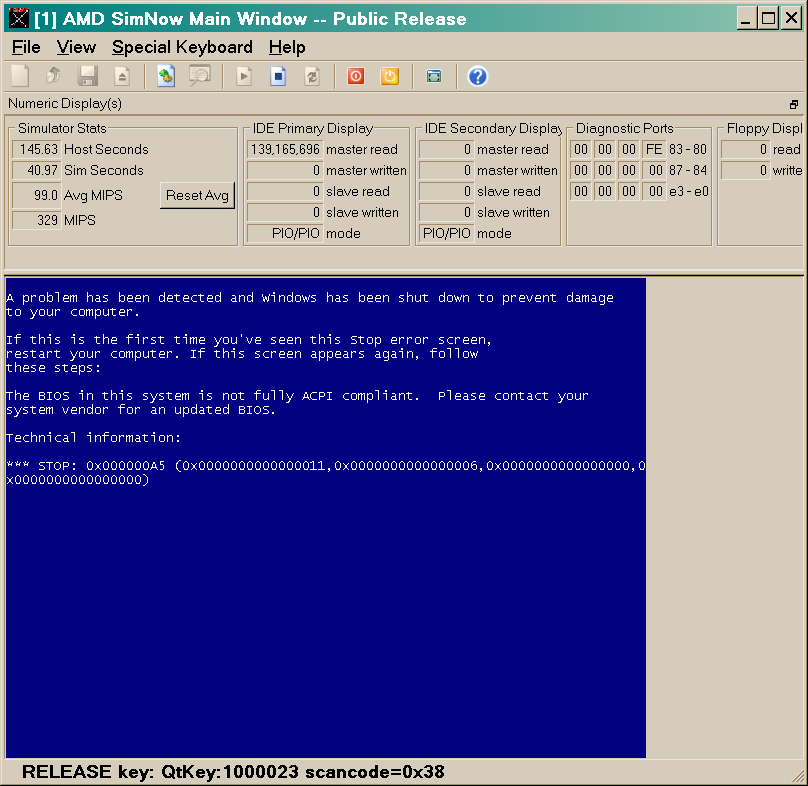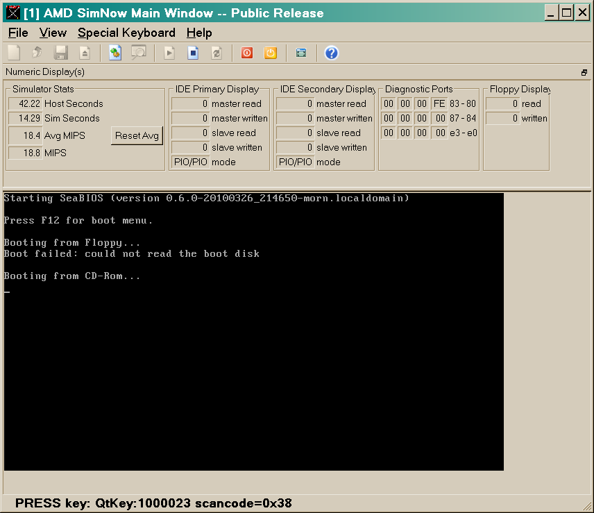 At this point, the simulation waits a couple of minutes for a keyboard response (needs debugging). Press a key while the mouse cursor is in the simnow window to avoid the delay. Next, the seabios payload executes: