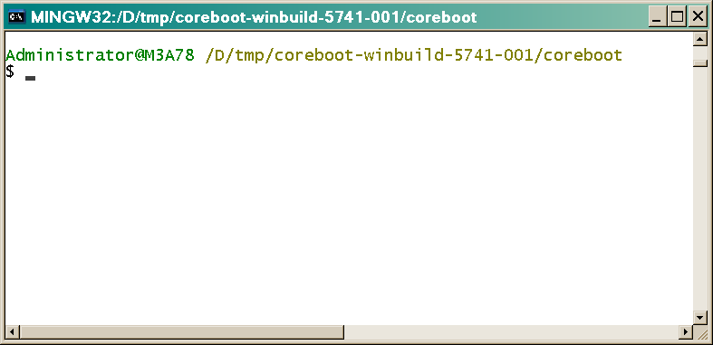 An msys+mingw that is customized for building coreboot and SeaBIOS can be downloaded here. Decompress the archive into any directory. Note: Avoid the use of spaces in the project path and directory name! In the top level is an msys directory. This is the complete coreboot-ready msys+mingw. The go.bat file starts the coreboot build environment.