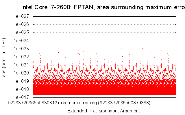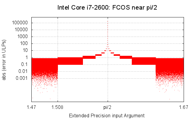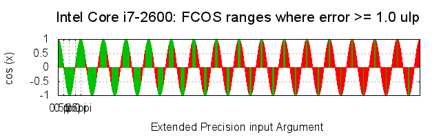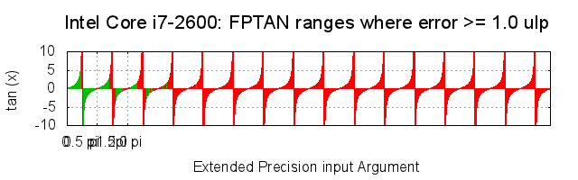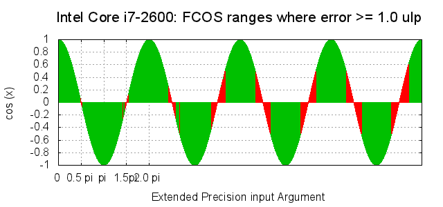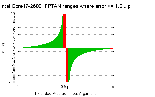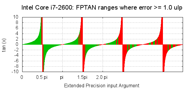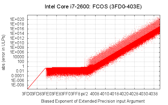For nearly 20 years Intel has claimed high accuracy for the transcendental floating point instructions in its PC processor products. Intel documentation for the 1993 Pentium states: On the Pentium processor, the worst case error on functions is less than 1 ulp when rounding to the nearest-even and less than 1.5 ulps when rounding in other modes. This claim has never been true for the instructions fsin, fcos, fsincos, and fptan. The red in the plots below show ranges where the error exceeds 1.0 ulp. (see large versions).