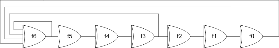 f7 (t) = f0 (t-10) ^ f0 (t-7) ^ f0 (t-3)